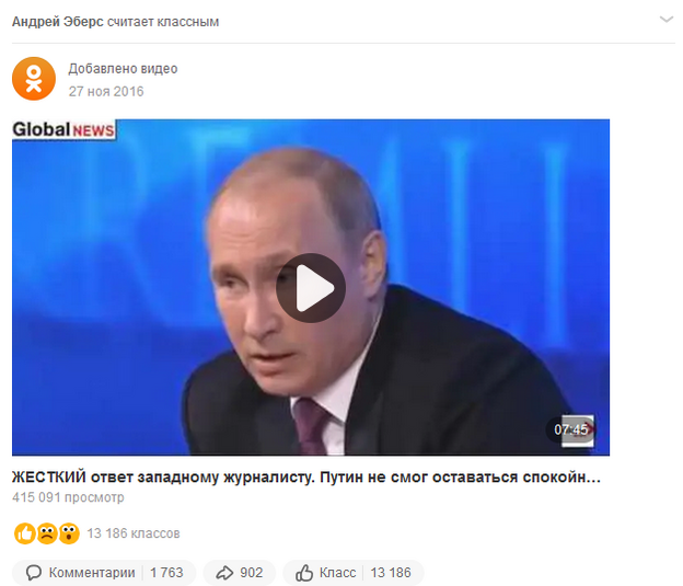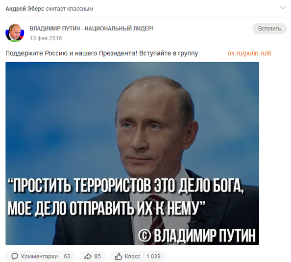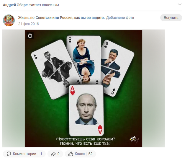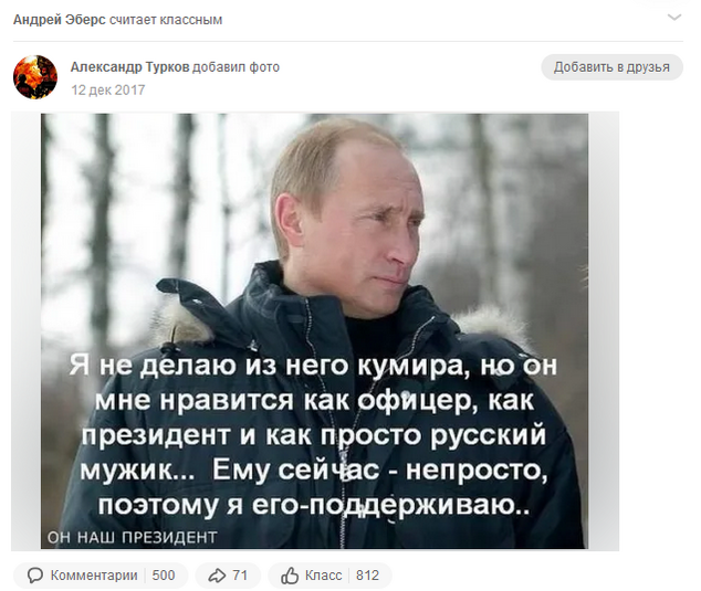 Зі сторінки російського німця можна зробити висновок, що він є фанатом Володимира Путіна та інших представників «русского міра».