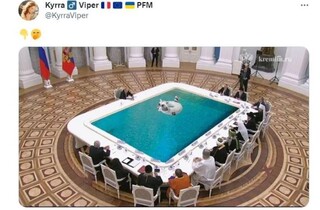 Як ідеться в матеріалі, завдяки столу відстань між кремлівським диктатором та його оточенням становить близько шести метрів. Старий стіл, який також викликав багато насмішок, забезпечував велику безпечну дистанцію. Тоді користувачі платформи Х бурхливо розмірковували про зв'язок з пандемією коронавірусу та страхом Путіна заразитися цим вірусом.