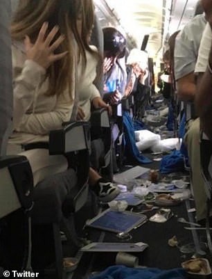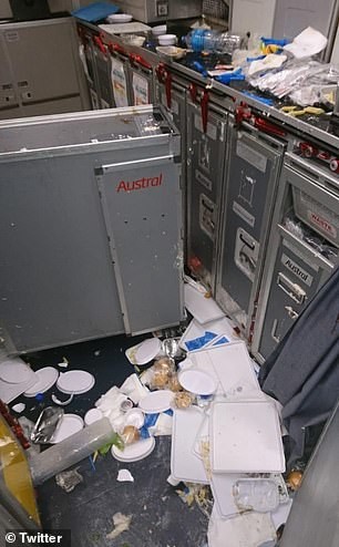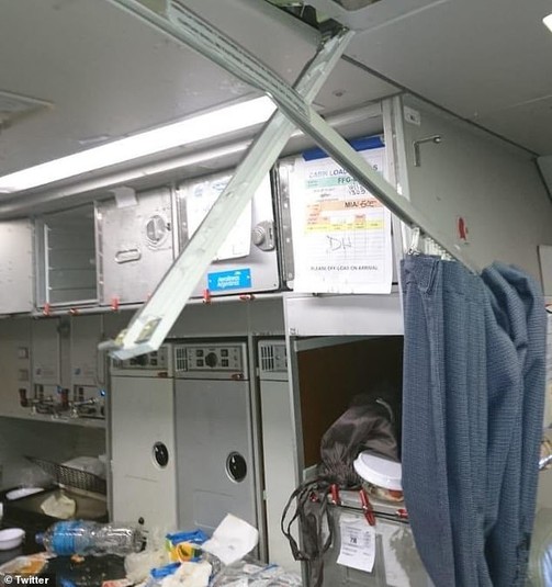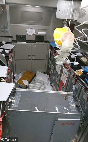 Зокрема, на фото видно непотріб у проході літака. А на кухні утворився безлад. Також там можна побачити кисневі маски, що висять зі стелі, перекинуті ємності з їжею. На одній з фотографій видно тканину зі слідами крові.