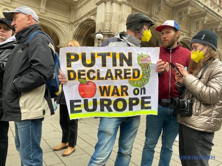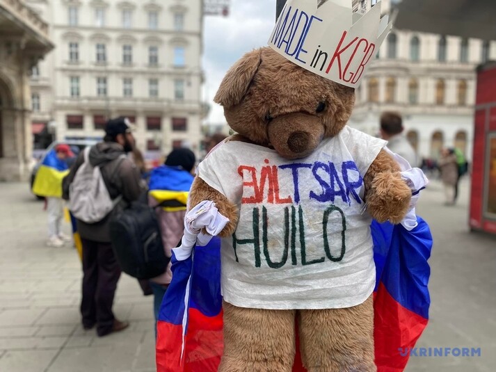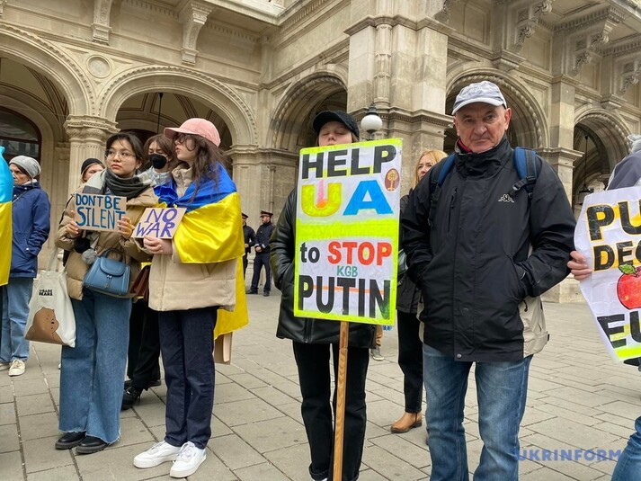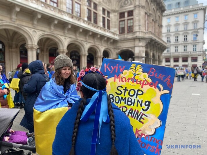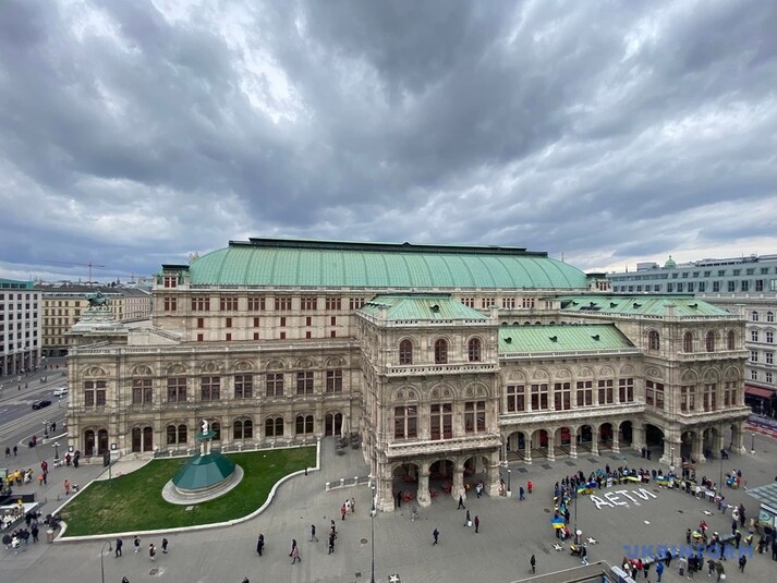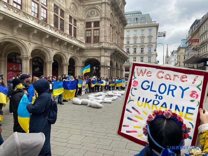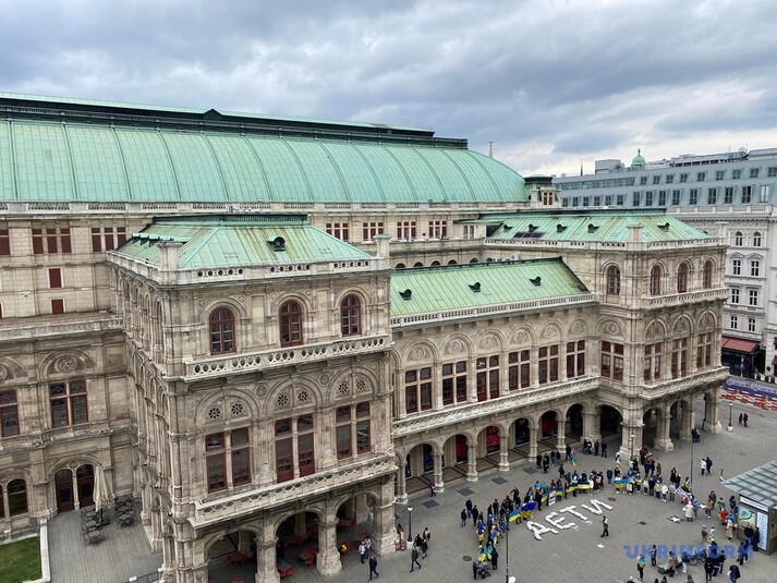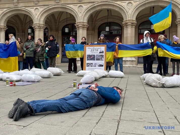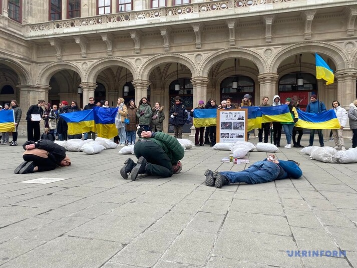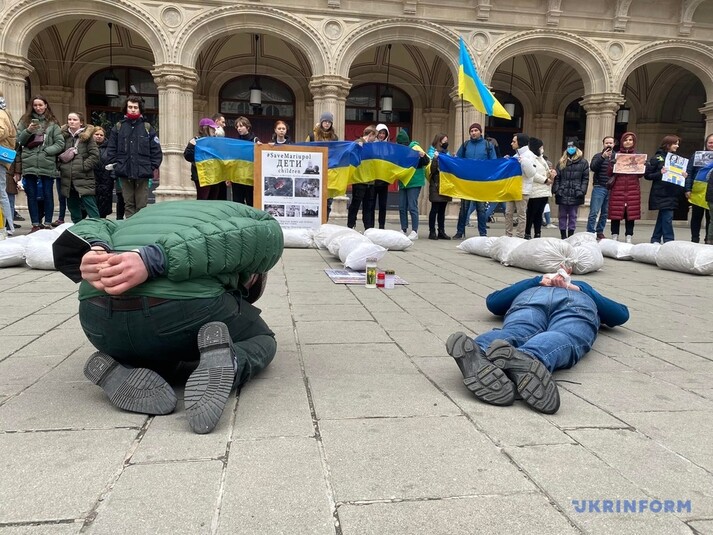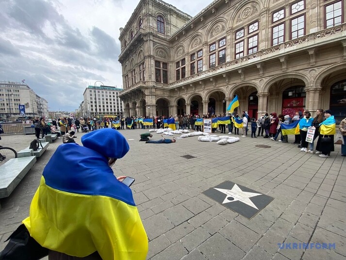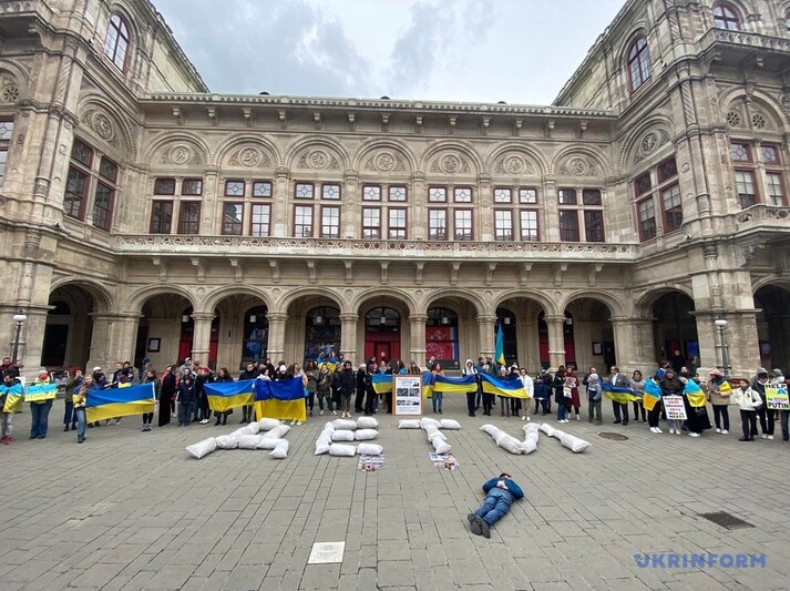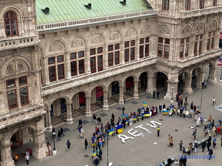 Під час акції, організованої «Товариством української молоді в Австрії» (ТУМА), на площі біля опери було викладено з білих мішків напис російською мовою «Дети» – як це було біля будівлі розбомбленого театру у Маріуполі.