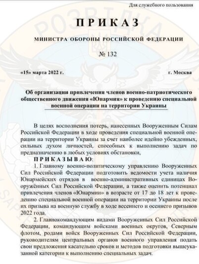Відповідний наказ «Про організацію залучення членів військово-патріотичного громадського руху «Юнармія» до проведення спеціальної операції на території України» підписано міністром оборони РФ Шойгу.