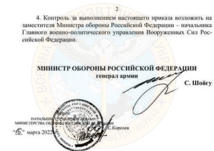 У документі йдеться про підготовку звітності потенційного людського резерву у віці 17-18 років для залучення до бойових дій у складі окупаційної армії. Вище воєнне керівництво РФ має надати пропозиції стосовно проведення підготовки зазначеного особового складу в найкоротші терміни. Контроль за виконанням наказу покладено на начальника головного військово-політичного управління ЗС РФ Геннадія Жидка.
