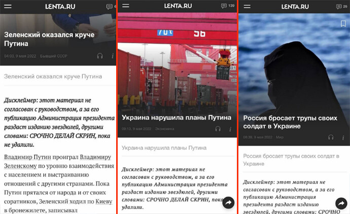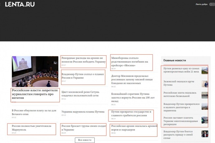 «На Lenta.ru з'явилися понад десять матеріалів із критикою президента Володимира Путіна і війни в Україні. Хоча зараз вони вже зникли із сайту, копія головної сторінки збереглася у веб-архіві», – пише ЗМІ.