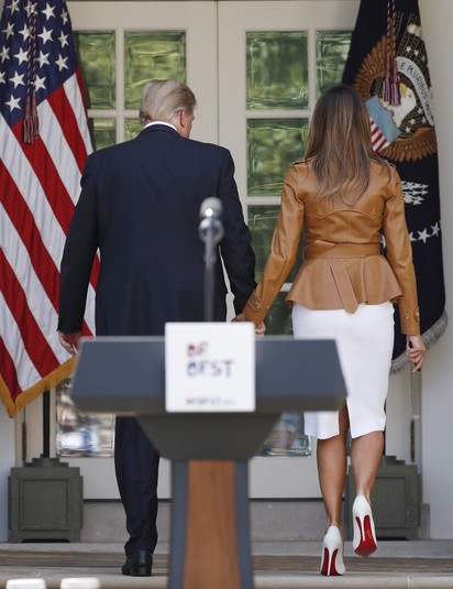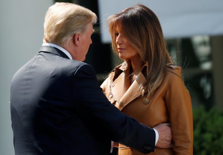 Меланія Трамп з'явилася перед публікою у строгому образі. Перша леді США вибрала світло-коричневу шкіряну куртку від Ralph Lauren, білі спідницю-олівець і туфлі-човники від Christian Louboutin.
