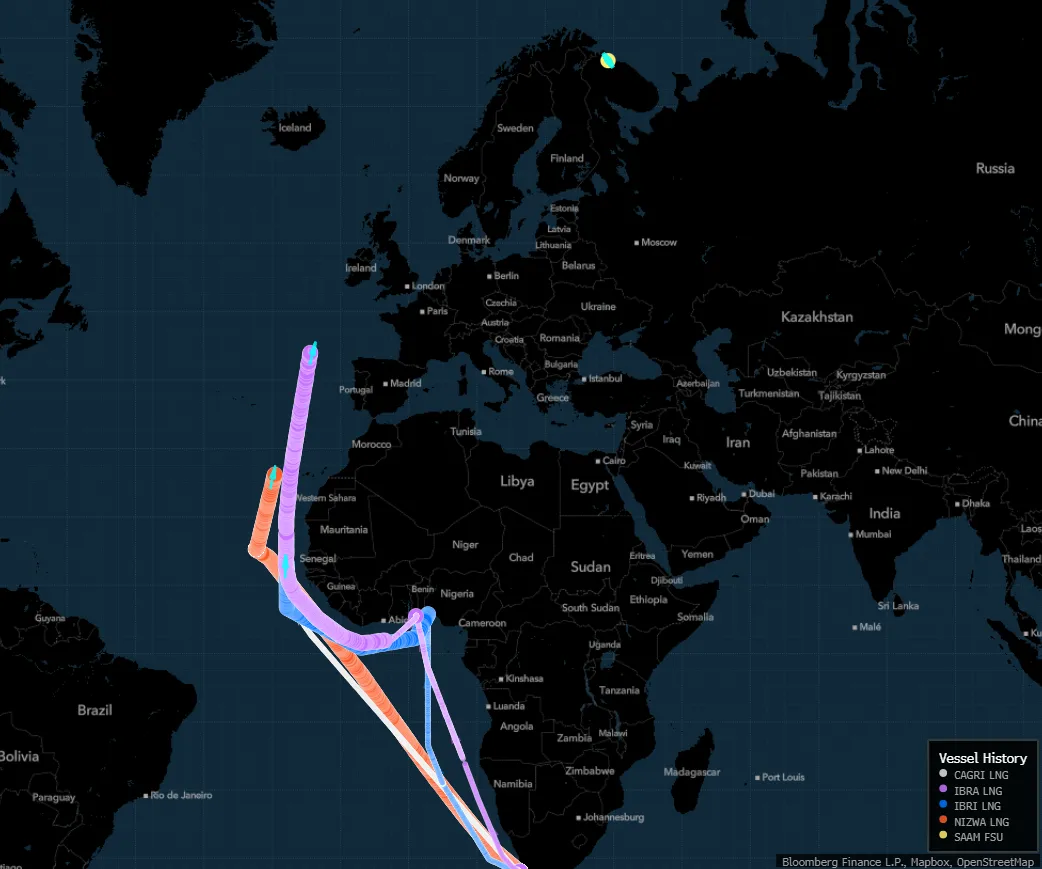 Згідно з даними відстеження суден, частина з них рухається Північною Атлантикою, а один із танкерів сигналізує про курс на Мурманськ. Порт розташований поблизу плавучого газосховища Saam, яке використовується для експорту з проєкту Arctic LNG 2, що перебуває під санкціями США.