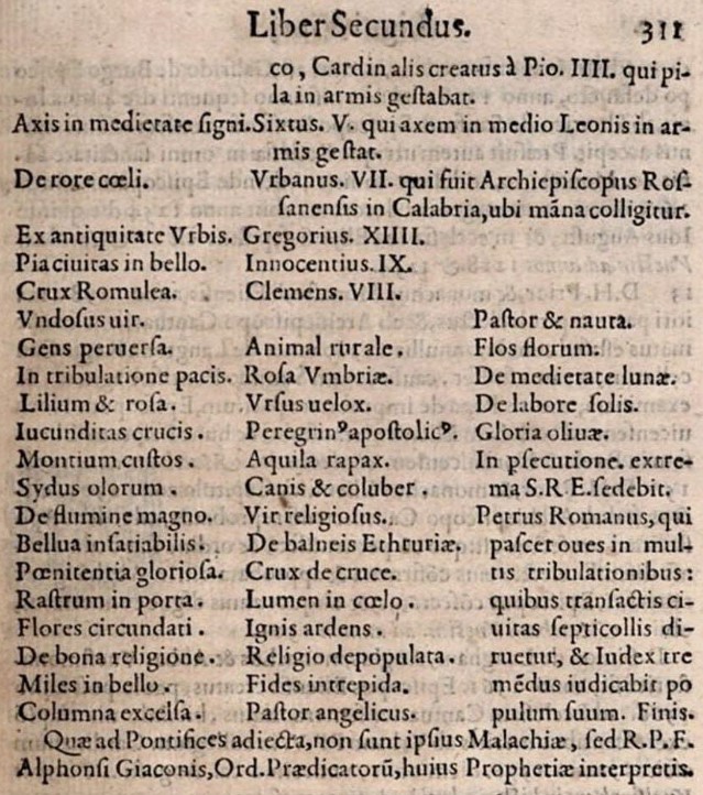 «В останні гоніння на Святу Римську Церкву запанує Петро Римлянин, який пастиме свою паству серед багатьох скорбот, після чого семигірне місто буде зруйноване, і страшний Суддя судитиме людей. Кінець». Вважається, що текст, приписуваний Папі Сіксту V (1585-1590), містить ключ до розгадки дати кінця світу: нібито правління Сікста V припадає на середину передбаченого періоду, а завершення настане рівно через 442 роки – виходить, у 2027-у. Дослідники зазначають, що перші 74 передбачення, які охоплюють пап до 1590 року, є вражаюче точними, тоді як наступні фрази стають більш розмитими і неконкретними. Деякі вчені припускають, що текст міг бути підроблений у XVI столітті.