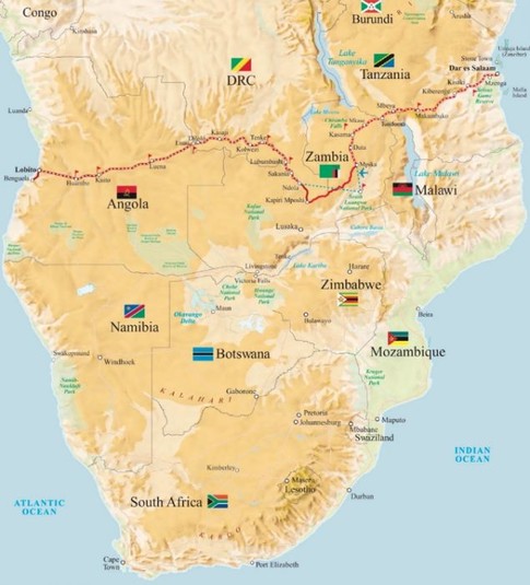 Траса складається з двох частин: Танзанійської залізниці, яку в 1970-х допомогло побудувати уряд Китаю, і залізниці Бенгела, побудованої Китайською залізничною будівельною корпорацією і введеної в експлуатацію у 2017 році.