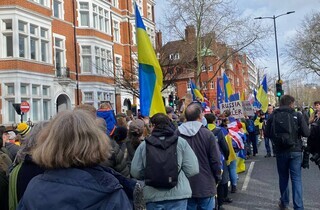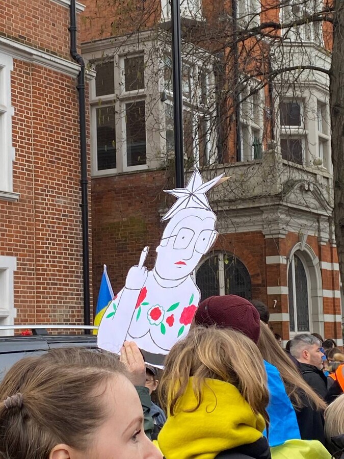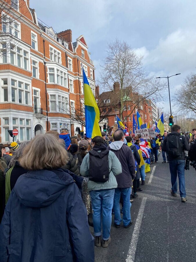 Мітингарі з українськими прапорами та красномовними плакатами зібралися біля посольства РФ та пройшлися вулицями західного Лондону. Серед учасників сотні українських біженців, які втікали від російського терору. Були помічені і представники інших країн, зокрема, Великої Британії та Грузії.