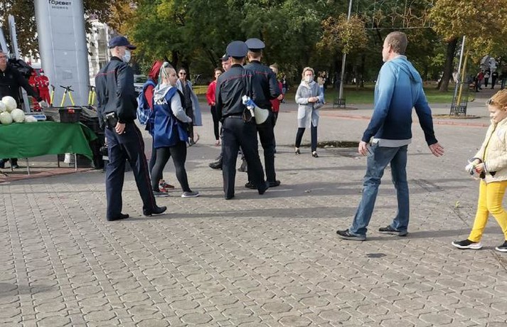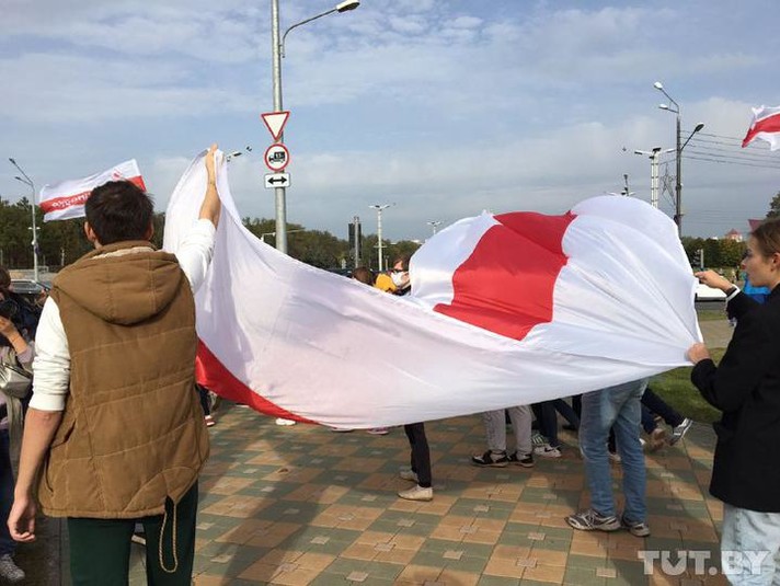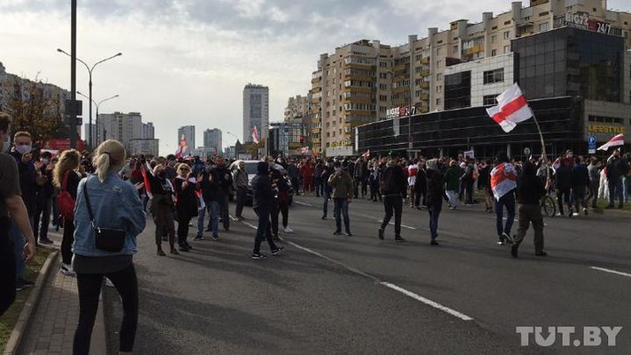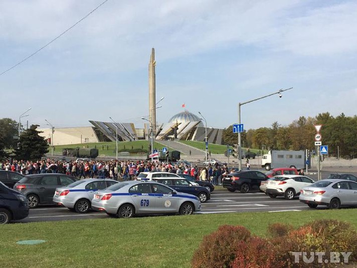 Проспектом Машерова від станції метро «Молодіжна» в бік стели по тротуарах іде кілька організованих колон. В сумі там налічується більше тисячі людей.