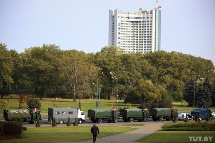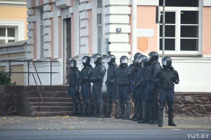 У центрі Мінська багато спецтехніки та правоохоронців. В районі станції метро «Пушкінська», «Московська», поруч із площею Незалежності та в інших місцях були помічені автозаки й мікроавтобуси без номерів.