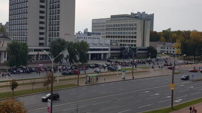 Повідомляється, що між готелем «Ювілейний» і Будинком профспілок зібралося кілька десятків людей. Вони просто стоять, іноді скандуючи: «Живе Білорусь!».