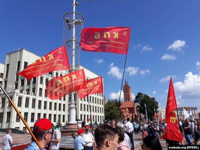 У центрі площі група з близько півсотні людей скандують «За батьку!», «За Білорусь». Видно офіційні державні прапори та один російський («Європейська правда» поки не бачила фото з прапором РФ).