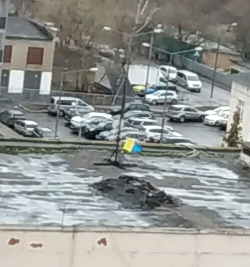 Очевидці розповіли, що символ української держави з'явився на даху адмінбудівлі ще 9-го квітня. Український прапор пробув на даху увесь ранок.