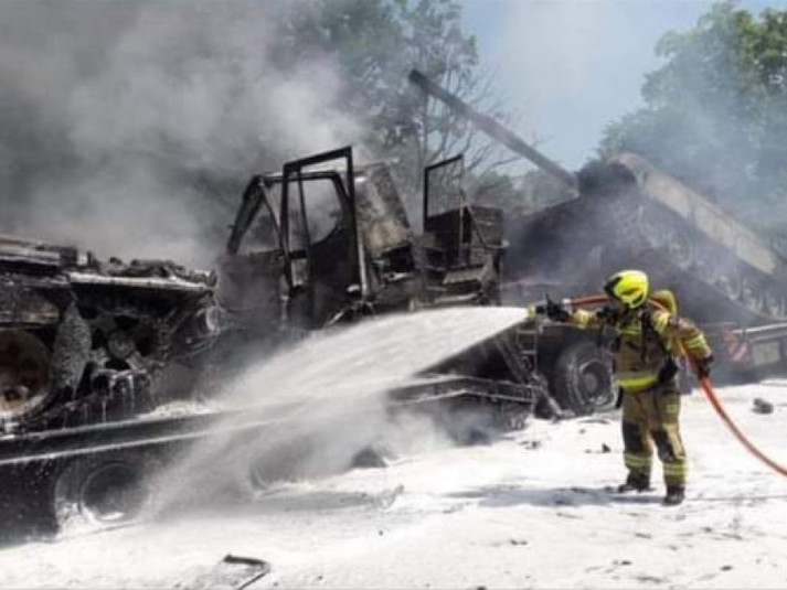 Після зіткнення сталася пожежа, через яку загорілася бойова техніка.