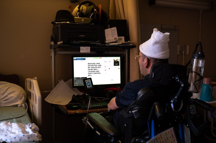 38-річний чоловік, який побажав залишитися невідомим, 15 років тому переніс інсульт стовбура головного мозку, який розірвав нейронний зв'язок між його мозком і голосовими зв'язками. Він паралізований нижче шиї і спілкується, натискаючи літери на клавіатурі покажчиком, прикріпленим до його бейсболки.