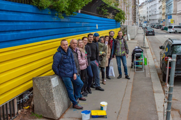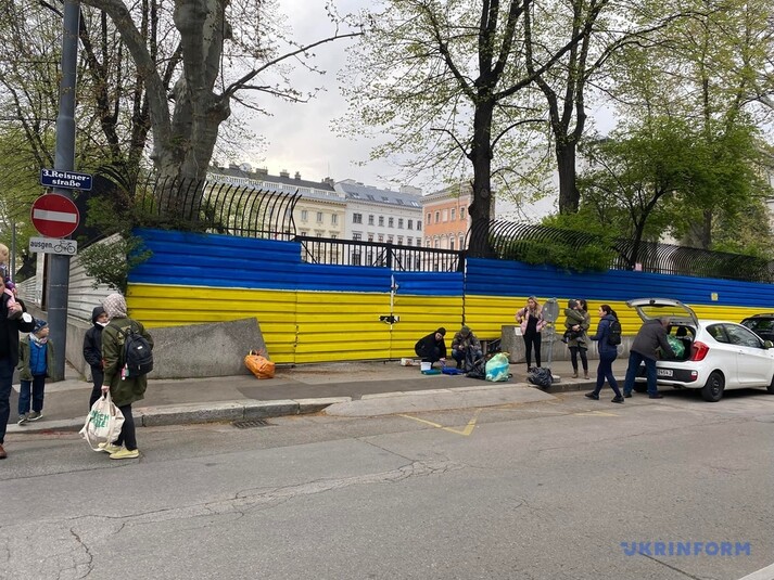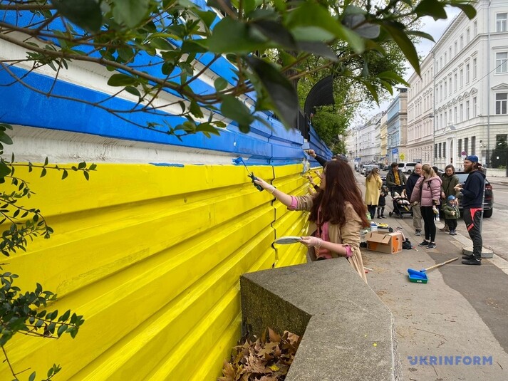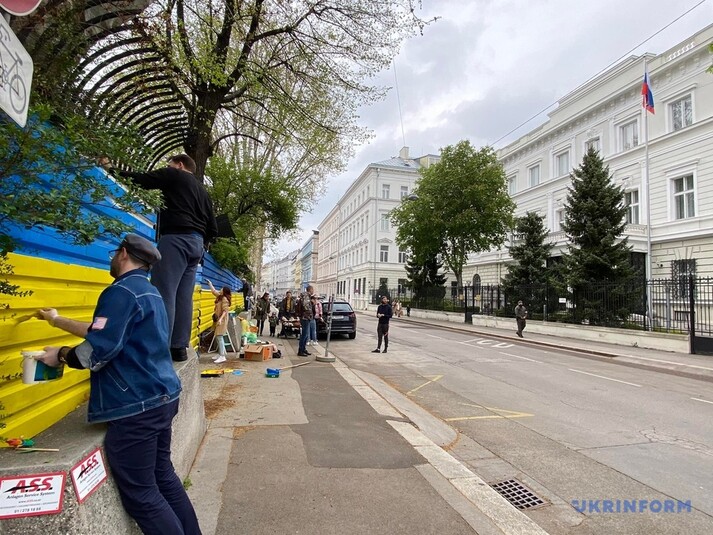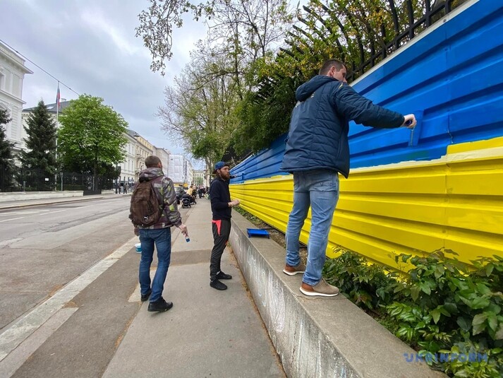 Сьогодні, 24 квітня, українці та друзі України з Німеччини та Білорусі пофарбували у синьо-жовті кольори українського прапора паркан навпроти будівлі посольства Росії у Відні. Про це повідомляє Укрінформ.
