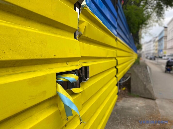 Однак пізніше ці фотографії було зірвано «невідомими». Саме після цього й виникла ідея пофарбувати весь паркан в українські кольори.