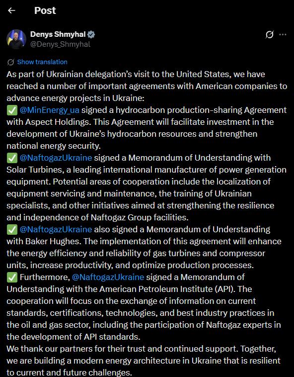 «НАК «Нафтогаз України» підписала Меморандум із провідним міжнародним виробником енергетичного обладнання Solar Turbines. Серед потенційних напрямів співробітництва – локалізація сервісу та технічного обслуговування обладнання, навчання українських фахівців та інші ініціативи, спрямовані на підвищення енергетичної стійкості та незалежності об’єктів Групи Нафтогаз», – написав Шмигаль