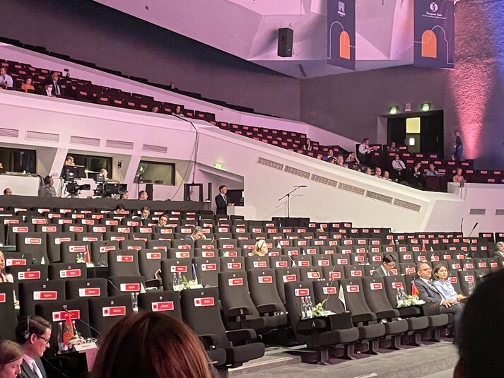 Росія досі є державою-членом ЄБРР. Максім Рєшетніков, управляючий від Росії, збирався розповісти колегам, як їхнім країнам шкодять санкції, накладені на Росію, і поскаржитися на русофобію, але виступав він у майже порожньому залі.