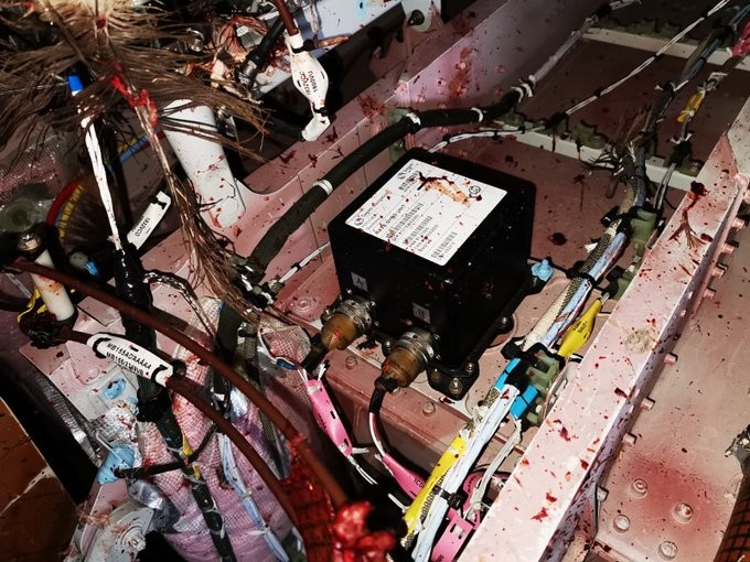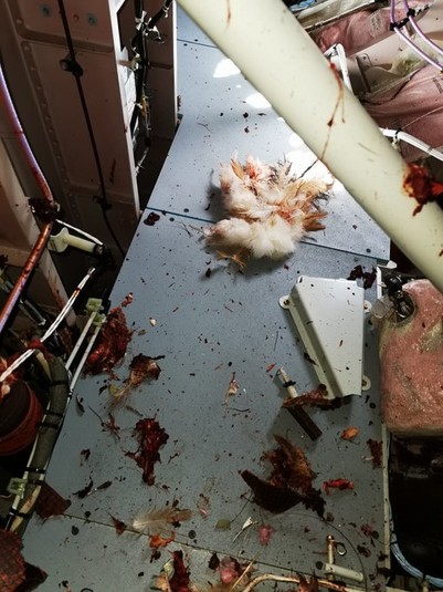 На розміщеному кадрі відображена діра в корпусі повітряного судна в районі кабіни пілотів, а також сліди перебування там тварини - пір'я і бризки крові.