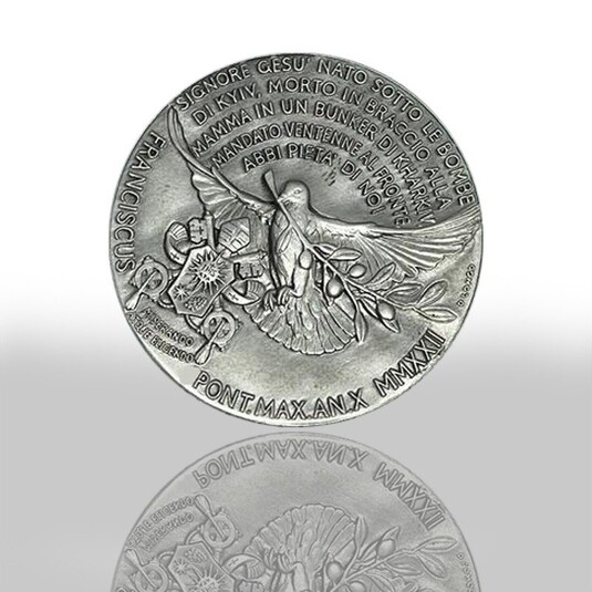 На аверсі Даніела Лонго зображує голуба миру, внизу герб Папи Франциска та частина молитви, яку він прочитав під час загальної аудієнції 16 березня 2022 року, сердечне благання про милосердя для кожної людини, яка любить Христа та страждає через війну.