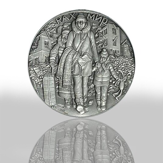 Монету оформили художниці Орієтта Россі та Даніела Лонго. На реверсі зображено трьох людей, які тікають із міста, зруйнованого бомбами. Усе їхнє життя вмістилося у валізу, дитина тримає у руці м’яку іграшку. Угорі латиницею та кирилицею напис «Pax – Mиp».