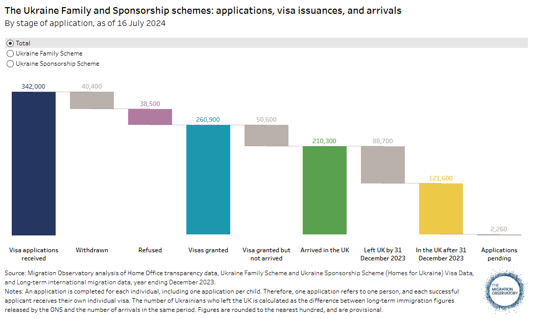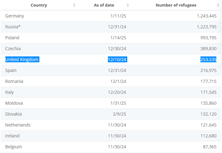 За даними Statista, станом на грудень 2024 року у Великій Британії проживає близько 253,535 українських біженців. Більшість із них прибули за програмами Ukraine Family Scheme та Homes for Ukraine Sponsorship Scheme, які були запроваджені після початку повномасштабного вторгнення Росії в Україну.
