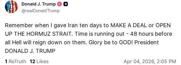 «Час спливає – залишилося 48 годин, перш ніж на них впаде справжнє пекло. Слава Богу!», – написав Трамп.