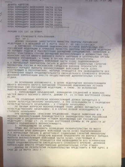 «В телеграмі, адресованій командирам дев’яти військових частин, висловлюється обурення щодо звернення російських військовослужбовців до центральних органів військового управління. Як випливає з документа, окупантам обмежують грошові виплати, обіцяючи натомість надати додаткові вихідні. При цьому, забороняють скаржитися на відсутність фінансування та навіть призначають провадження щодо таких спроб», – йдеться у повідомленні.