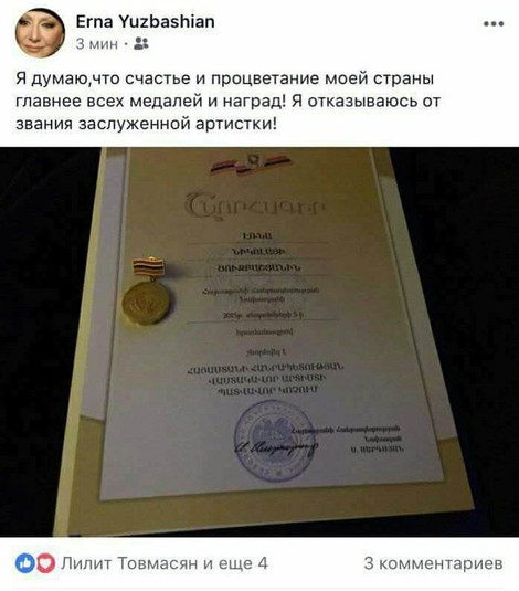 Зокрема від звання народної артистки відмовилася Ерна Юзбашян. За її словами, «щастя і процвітання моєї країни найголовніше всіх медалей і нагород».