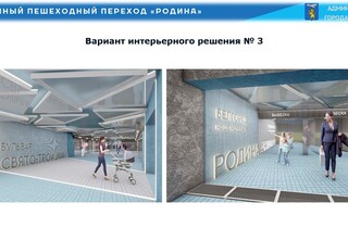 Зокрема, містяни самі могли вибрати один із трьох схожих варіантів інтер'єрних рішень для ремонту підземного переходу на «Батьківщині». Переміг третій варіант. Передбачалося, що у цьому проєкті використають такі основні образи: білгородський прапор, крейда, небо, хмари. Відобразити їх планувалося й у кольорі.