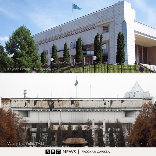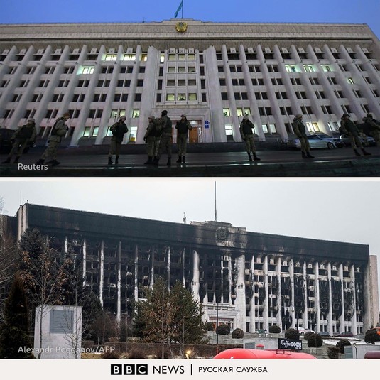Після масових погромів, що відбувалися останніми днями в Алмати, багато міських будівель та споруд схожі на класичну зону бойових дій. Добірку моторошних світлин опублікував Telegram-канал російської служби BBC.