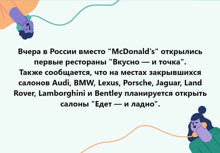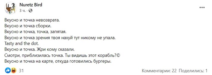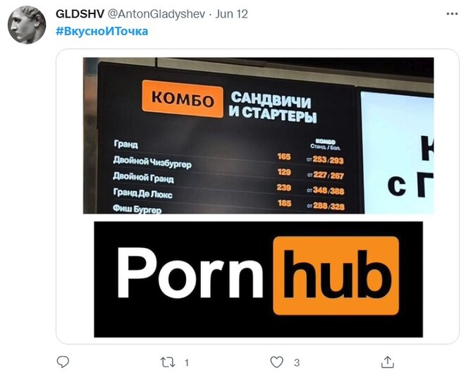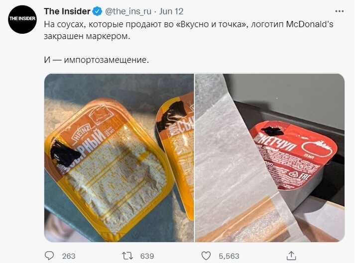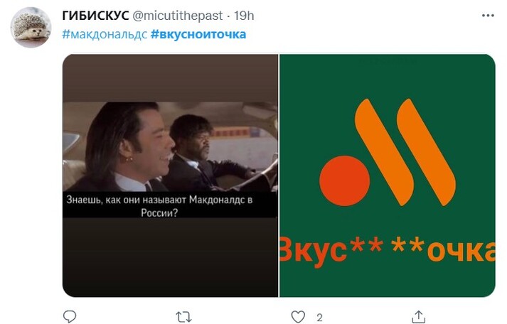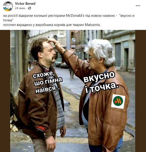 Користувачі соцмереж тролять Росію, відкрила власний «McDonald's» після офіційного виходу мережі закладів швидкого харчування з країни-агресорки. Відтепер росіяни зможуть перекусити у закладах під назвою «Вкусно и точка», логотип яких дуже схожий на лого португальської компанії з виробництва кормів для тварин Matosmix.