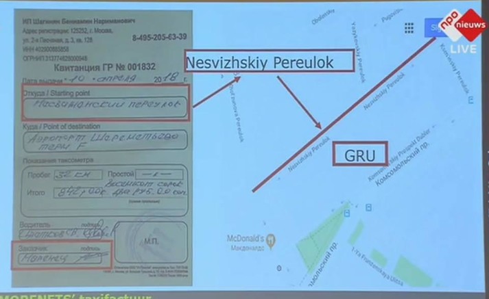 Крім того, у одного з підозрюваних було виявлено чек з таксі, який підтверджує, що в аеропорт Шереметьєво він їхав з штаб-квартири ГРУ в Москві. Також спецслужби з'ясували, що один з телефонів затриманих використовувався поряд з будівлею ГРУ в Москві.
