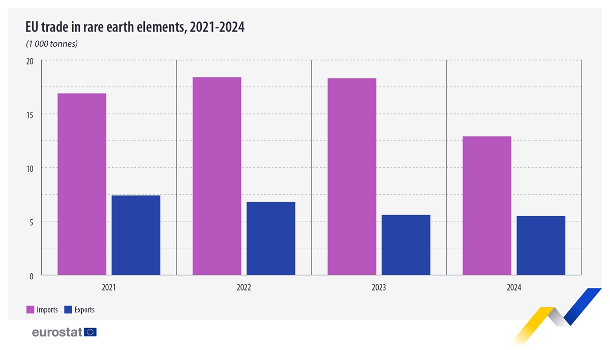 На сайті Європейської комісії оприлюднено інформацію, що в 2024 році до ЄС було імпортовано 12,9 тис. тонн рідкоземів, що на 29,3% менше порівняно з 2023 роком. У той же час з ЄС було експортовано 5,5 тис. тонн цього товару.