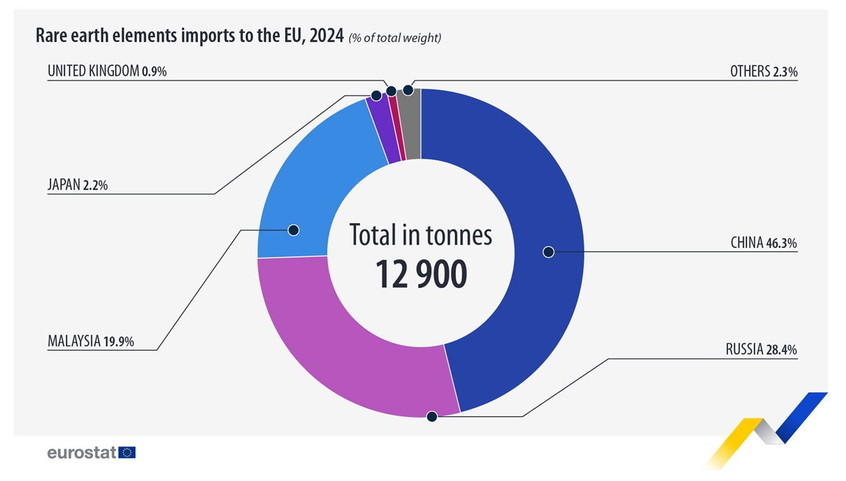 Майже половина імпорту рідкоземів надійшла з Китаю у 2024 році, що становить 46,3% від загального імпорту (6 тис. тонн). На другому місці Росія – 28,4% імпорту (3,7 тис. тонн), на третьому – Малайзія з показником 19,9% імпорту (2,6 тис. тонн).