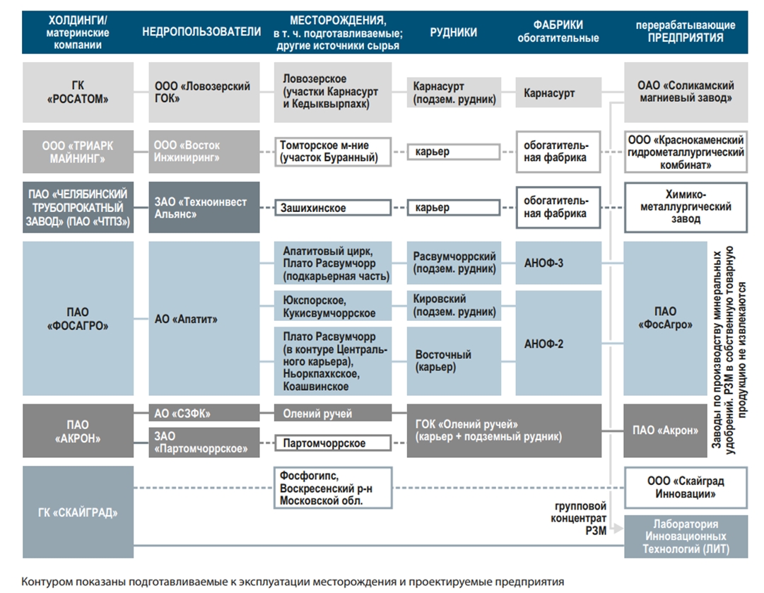 Ключовими підприємствами з видобутку рідкісноземельних металів у Росії є Ловозерський ГЗК та ВАТ «Солікамський магнієвий завод». До інших підприємств, які виробляють концентрати рідкоземів, також входять «Уралредмет» (колишній Пишмінський завод), АТ «Далур», АТ «ТГЗК «Ільменіт» та інші.