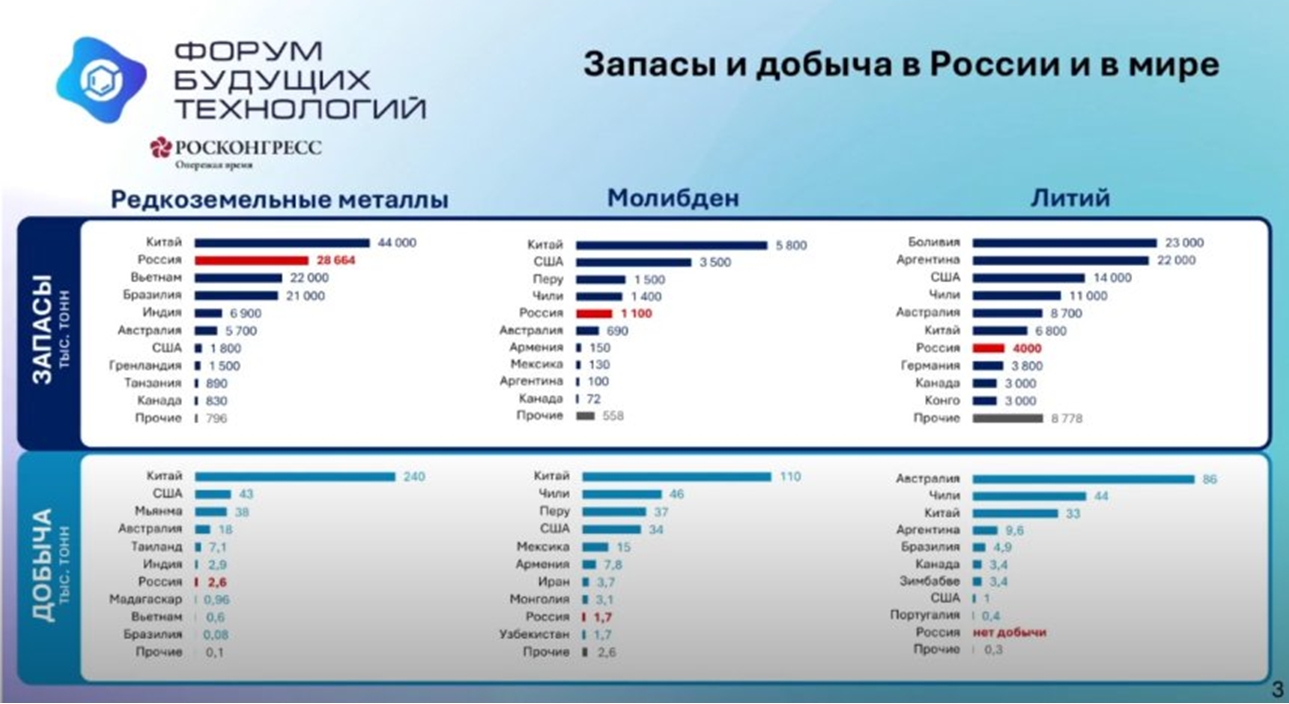 Росія посідає друге місце у світі за запасами рідкоземів. Обсяг розвіданих запасів, за даними гірничорудного підрозділу ДК «Росатома», становить 28,66 млн. тонн. При цьому фактична забезпеченість залишається досить низькою: російські компанії змушені імпортувати готові вироби та компоненти через відсутність вітчизняної продукції в необхідних обсягах.