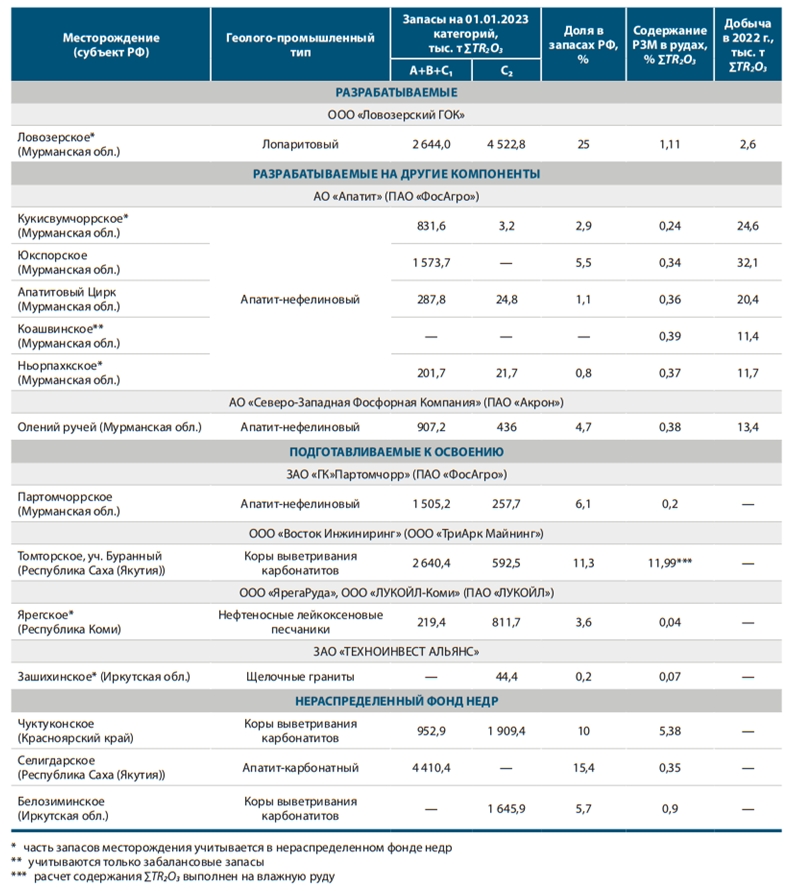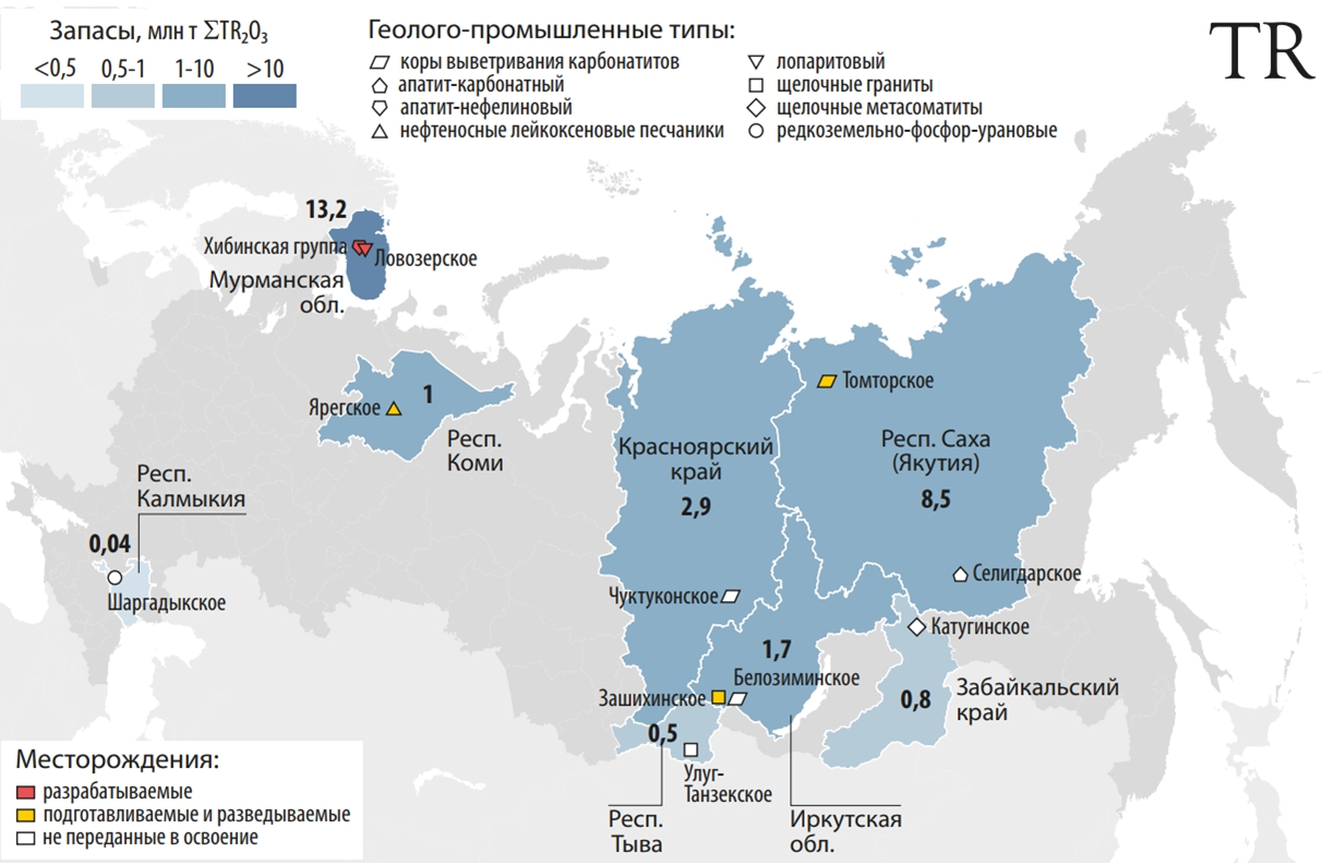 Запаси рідкоземів Ловозерського родовища в Мурманській області, за даними Федерального агентства з надрокористування РФ (Роснедра), становлять 7 млн. тонн. Запаси Томторського родовища в Якутії – 4 млн. тонн, запаси триоксидів рідкоземів Чуктуконського родовища – 2,8 млн. тонн.