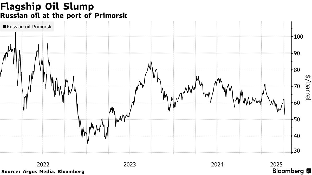 Згідно з даними Argus Media, у минулу п’ятницю ціна сорту Urals у балтійському порту Приморськ впала до $52,76. Від початку повномасштабного вторгнення РФ в Україну, понад три роки тому, російська нафта торгується зі значною знижкою відносно до світового стандарту Dated Brent.