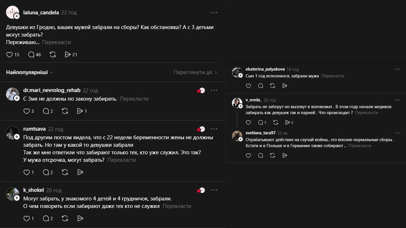 «Дівчата з Гродна, ваших чоловіків забрали на збори? Як ситуація? З трьома дітьми можуть забрати?» – питає вона.