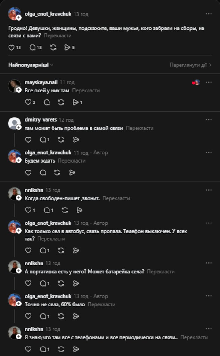 Ольга Кравчук із Гродна написала, що після того, як її чоловіка забрали на збори, звʼязок із ним зник: «Як тільки сів в автобус, зник звʼязок. Телефон вимкнений. У всіх так?»