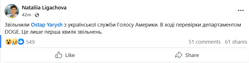 Департамент ефективності уряду США (DOGE), який очолює мільярдер Ілон Маск, звільнив журналіста української служби «Голосу Америки» Остапа Яриша. Про це повідомляє «Главком» з посиланням на шеф-редакторку видання «Детектор медіа» Наталію Лігачову.