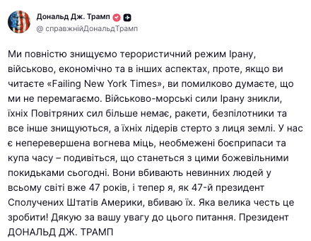 Трамп наголосив, що Америка знищує терористичний режим Ірану у військовому, економічному та інших аспектах.