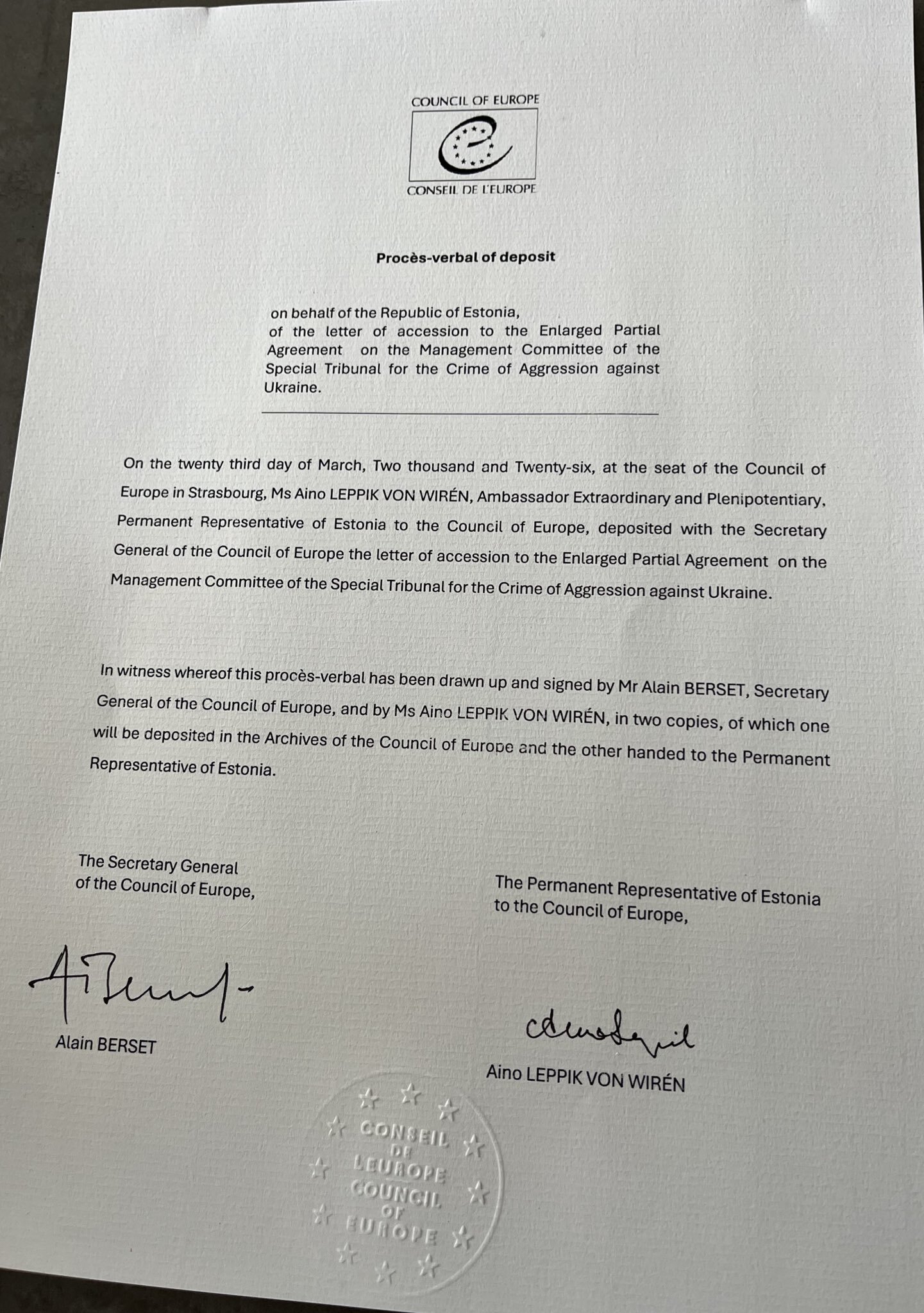 У МЗС зазначили, що 23 березня Естонія офіційно підписала документ, який підтверджує її приєднання до цього механізму. «Цим кроком ми наближаємося до створення спеціального трибуналу та забезпечення його повноцінного функціонування», – заявили у відомстві.