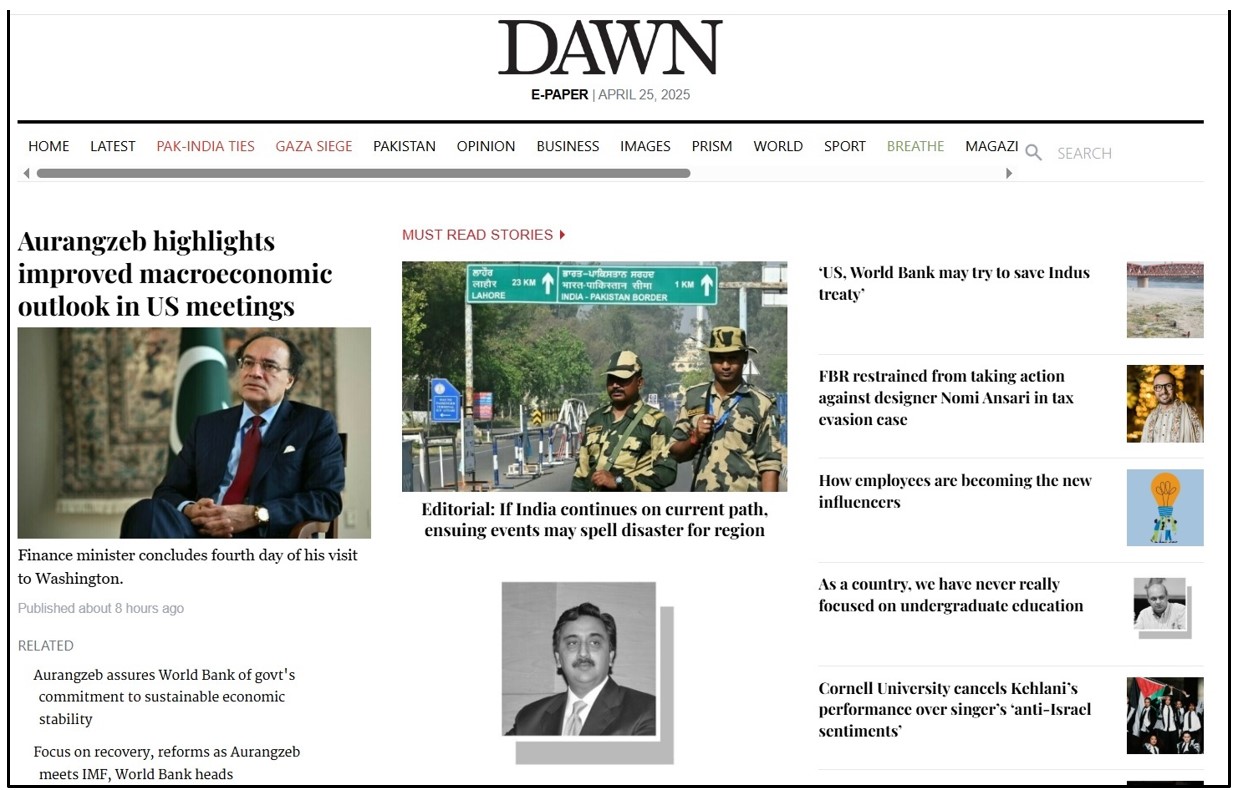 Провідне пакистанське видання Dawn вийшло з редакційною колонкою: в ній стверджується, що, якщо Індія продовжуватиме йти нинішнім шляхом, наступні події можуть призвести до катастрофи для регіону. «Індійські ЗМІ не допомогли справі, їхні воїни в кріслах волали про пакистанську кров і били в барабани війни. Індія звинуватила Пакистан у трагедії без жодних достовірних доказів…», – зазначає видання і закликає Індію відмовитися від ідеї перекриття водопостачання.