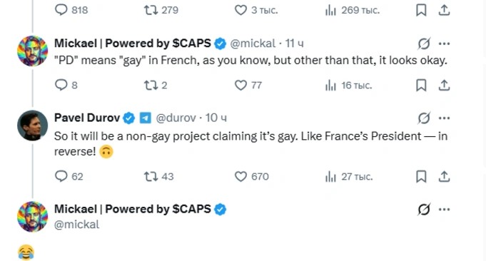 Замість того, щоб виправдовуватися або змінювати дизайн, Дуров відповів іронічним жартом, зачепивши президента Франції Еммануеля Макрона: «Тоді це буде негомосексуальний проект, який видає собою гомосексуальний. Як президент Франції, тільки навпаки», – написав мільярдер, додавши перевернутий усміхнений смайлик.