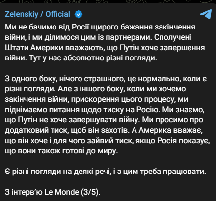 «Сполучені Штати Америки вважають, що Путін хоче завершення війни. Тут у нас абсолютно різні погляди», – заявив Володимир Зеленський.