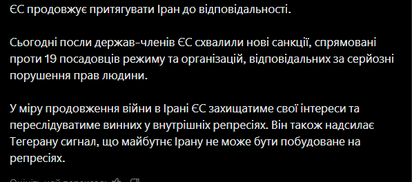 Очільниця дипломатії Євросоюзу Кая Каллас підкреслила, що цей крок – чіткий сигнал Тегерану про те, що за злочини проти людяності доведеться платити.