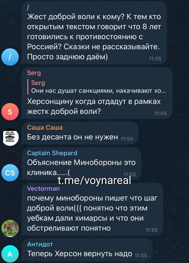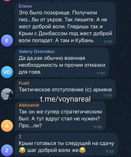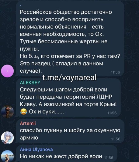 Однак, користувачі соцмереж вважають, що така тактика армії РФ не приведе до перемоги Росії у війні. Росіяни жаліються, що «наступним до здачі готується Крим та «Л/ДНР». Крім того, у коментарях можна побачити слова критики в бік Путіна та Шойгу. Росіяни вважають, що їх влада програє Україні.